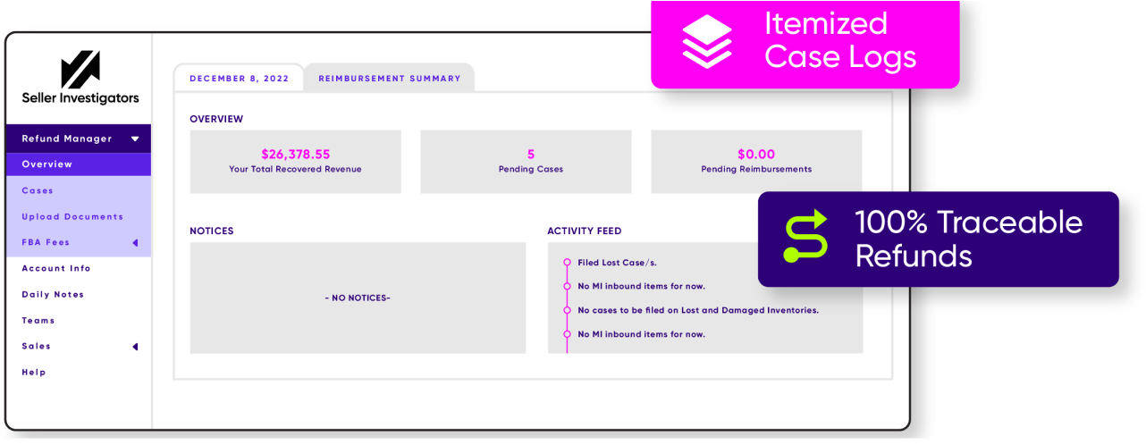 Our dashboard offers FBA sellers a clear and uncluttered view of Amazon’s reimbursement process. The Proprietary Refund Search Engine we’ve developed tracks and monitors every claim, and finds every last dollar – including the money other providers miss.